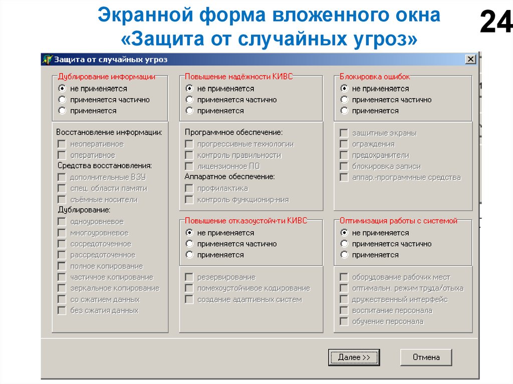 Экранной форма вложенного окна«Защита от случайных угроз»