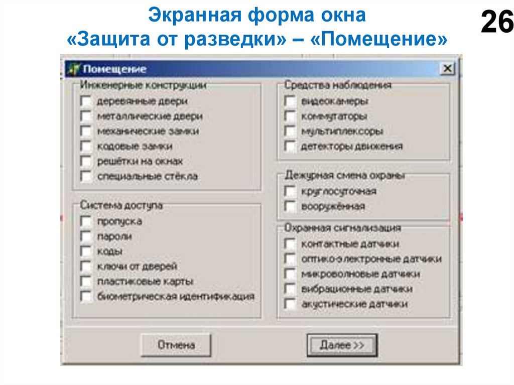 Экранная форма окна«Защита от разведки» – «Помещение»