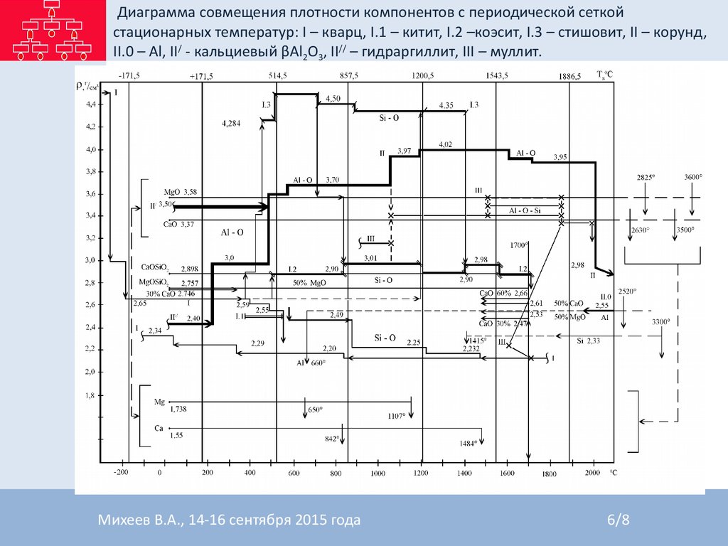 Диаграмма совмещения плотности компонентов с периодической сеткойстационарных температур: I – кварц, I.1 – китит, I.2 –коэсит, I.3 – стишовит, II – корунд,