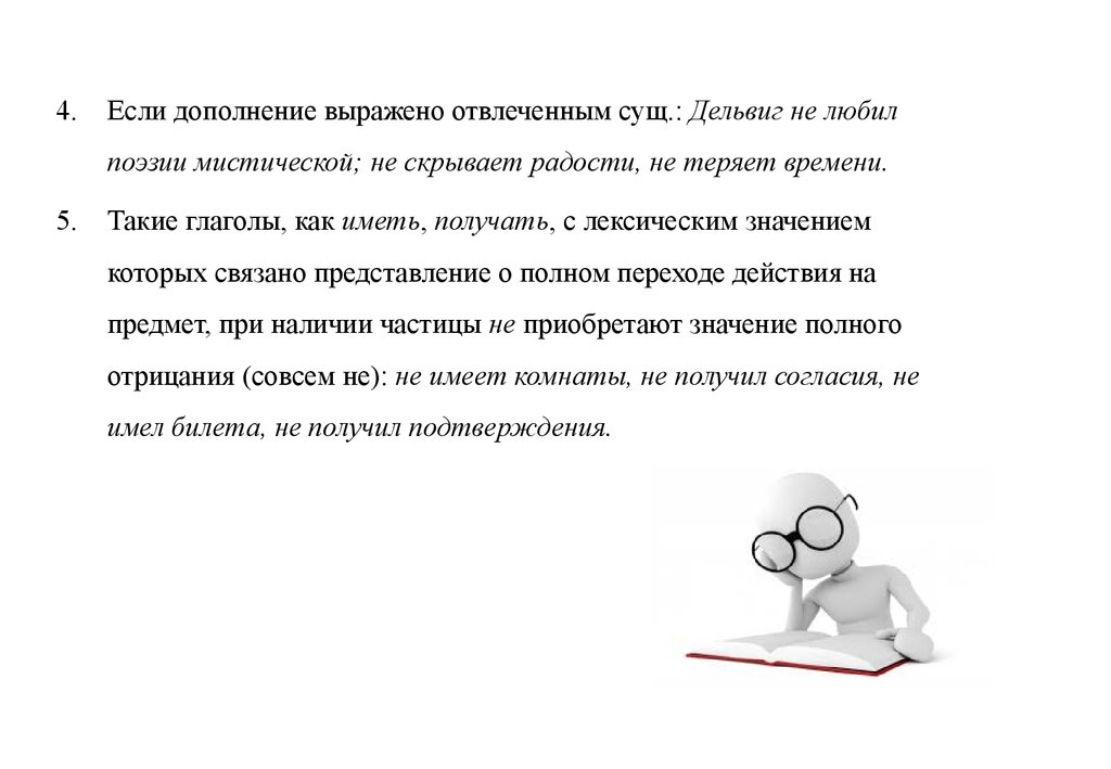 4.Если дополнение выражено отвлеченным сущ.: Дельвиг не любил