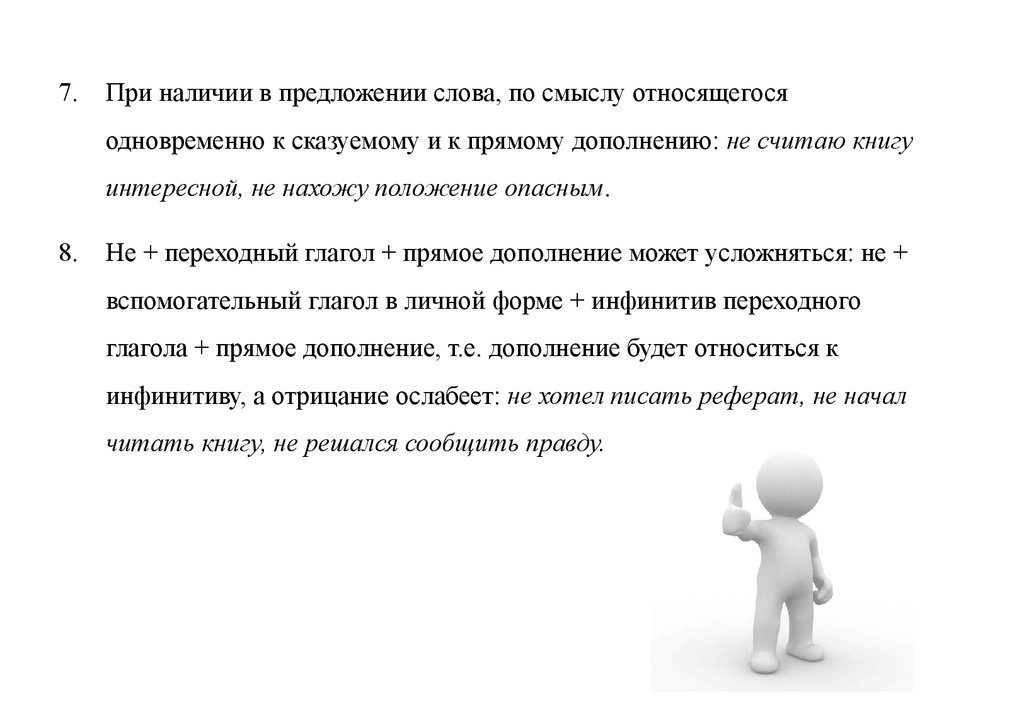 Не + переходный глагол + прямое дополнение может усложняться: не +
