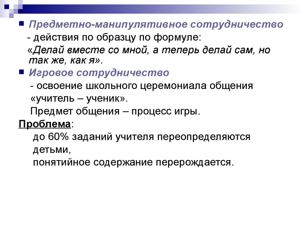 Предметно-манипулятивное сотрудничество- действия по образцу по формуле: