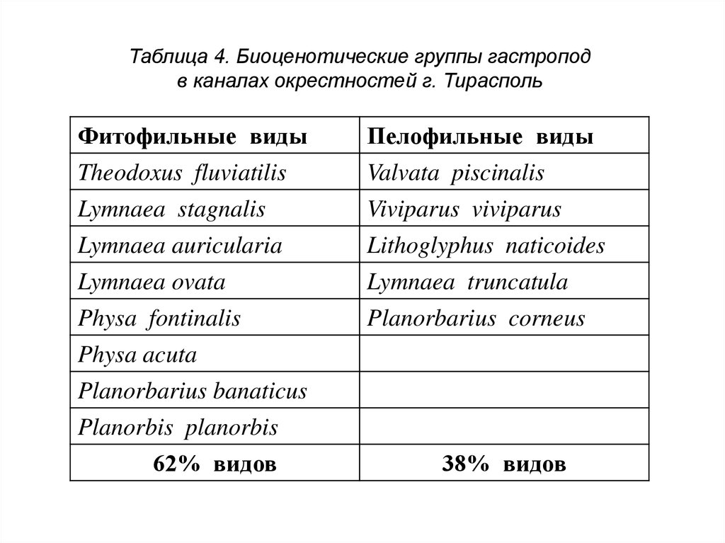 Таблица 4. Биоценотические группы гастроподв каналах окрестностей г. Тирасполь