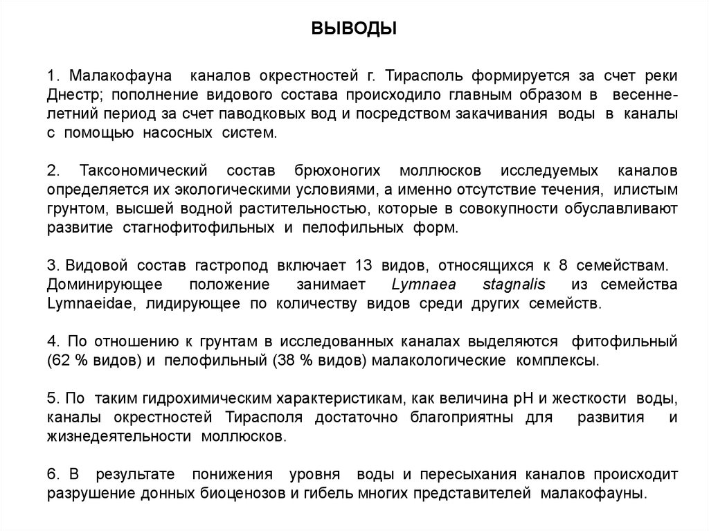 ВЫВОДЫ1. Малакофауна каналов окрестностей г. Тирасполь формируется за счет реки