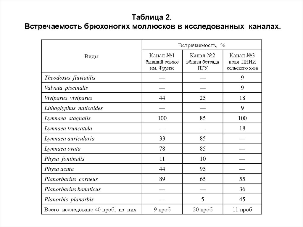 Таблица 2.Встречаемость брюхоногих моллюсков в исследованных каналах.