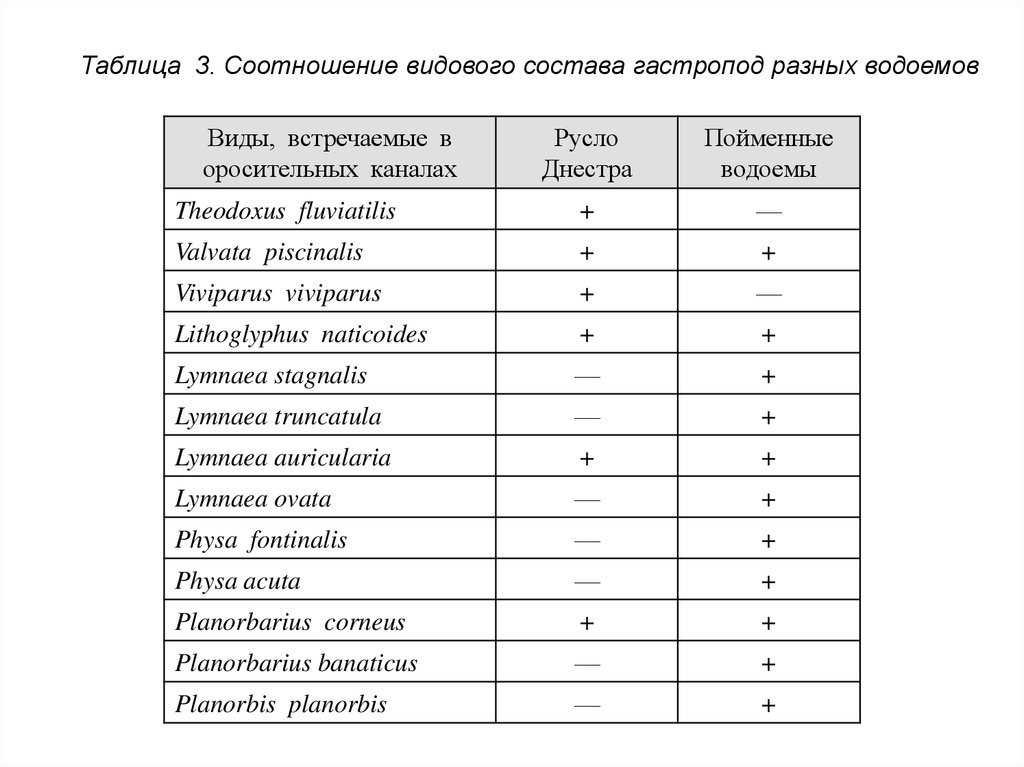 Таблица 3. Соотношение видового состава гастропод разных водоемовВиды, встречаемые в