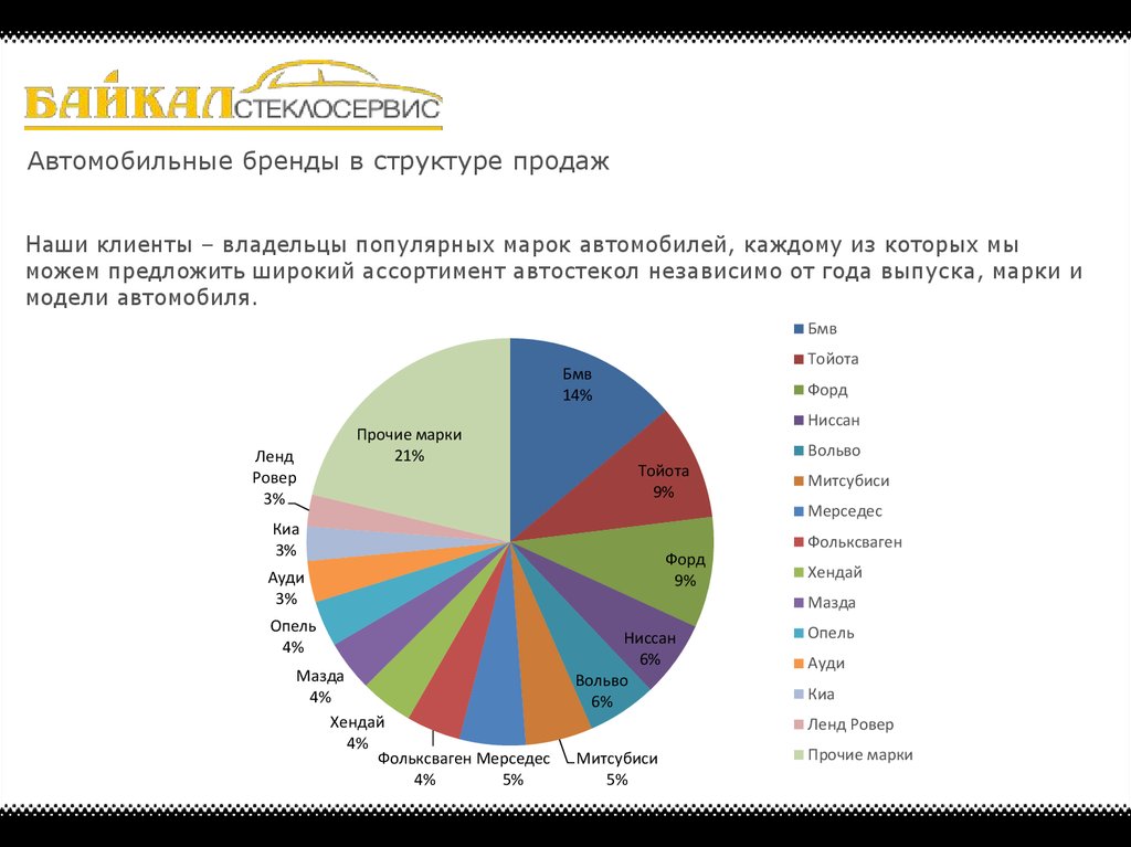 Автомобильные бренды в структуре продажНаши клиенты – владельцы популярных марок автомобилей, каждому из которых мы
