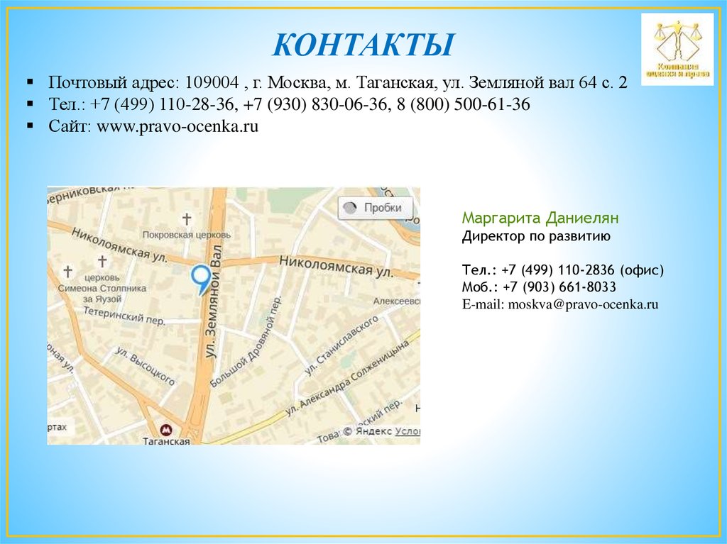 КОНТАКТЫПочтовый адрес: 109004 , г. Москва, м. Таганская, ул. Земляной вал 64 с. 2