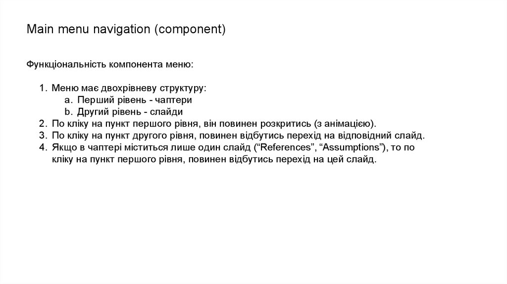 Main menu navigation (component)Для навігації по презентації повинне бути реалізоване меню. Для цього потрібно розробити
