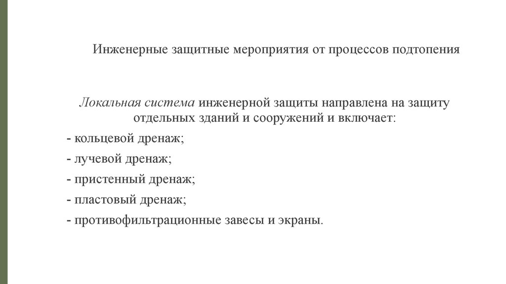 Инженерные защитные мероприятия от процессов подтопенияЛокальная система инженерной защиты направлена на защиту