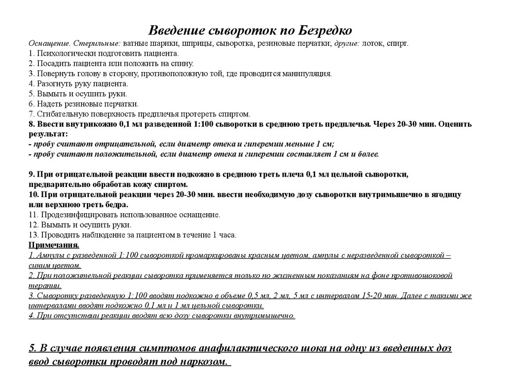9. При отрицательной реакции ввести подкожно в среднюю треть плеча 0,1 мл цельной сыворотки,