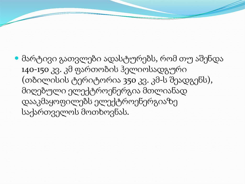 მარტივი გათვლები ადასტურებს, რომ თუ აშენდა140-150 კვ. კმ ფართობის ჰელიოსადგური