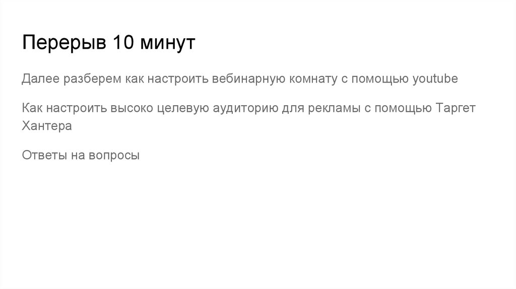 Перерыв 10 минутДалее разберем как настроить вебинарную комнату с помощью youtube