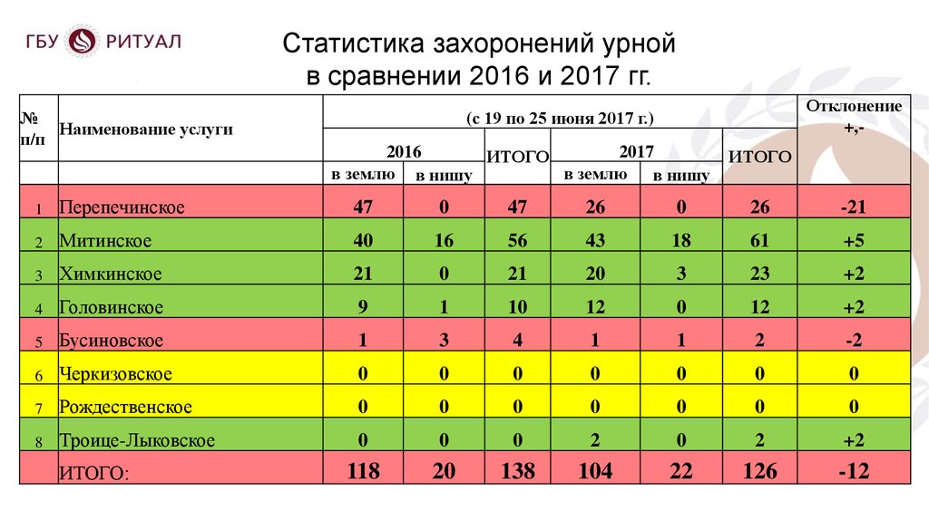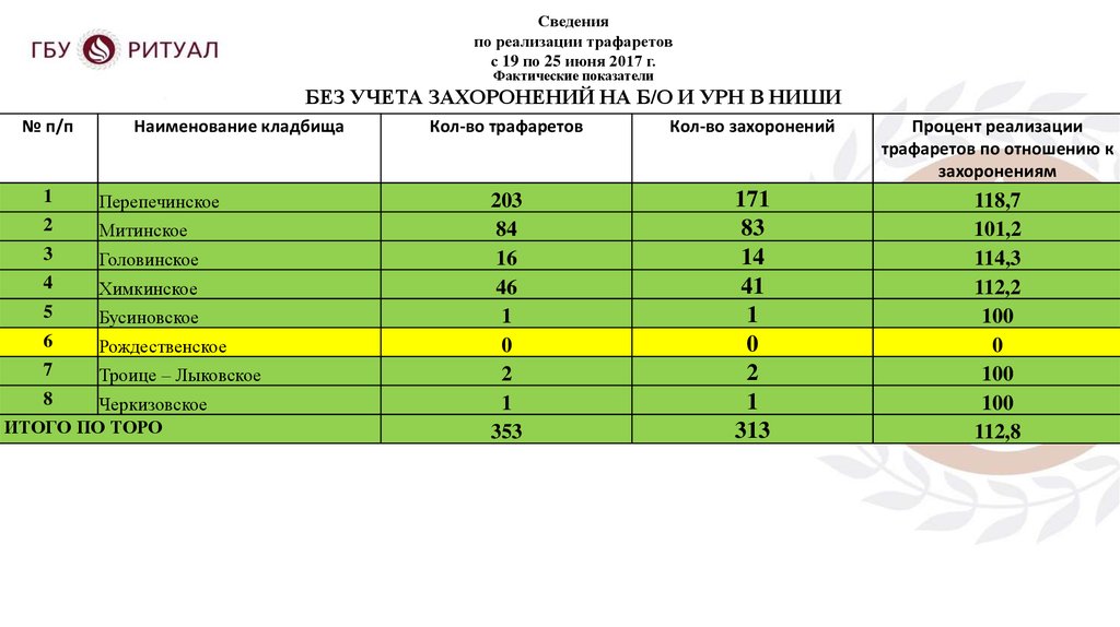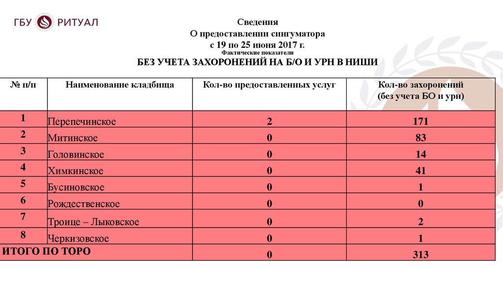 БЕЗ УЧЕТА ЗАХОРОНЕНИЙ НА Б/О И УРН В НИШИ