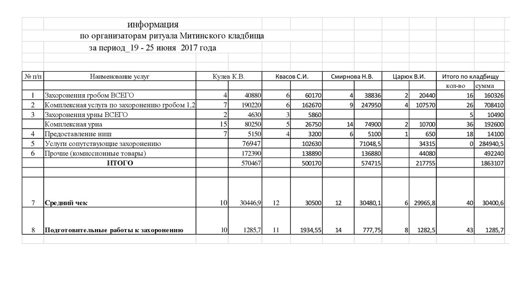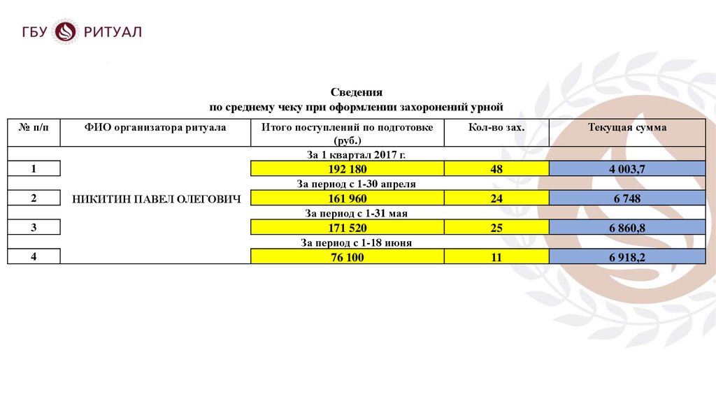 Сведенияпо среднему чеку при оформлении захоронений урной