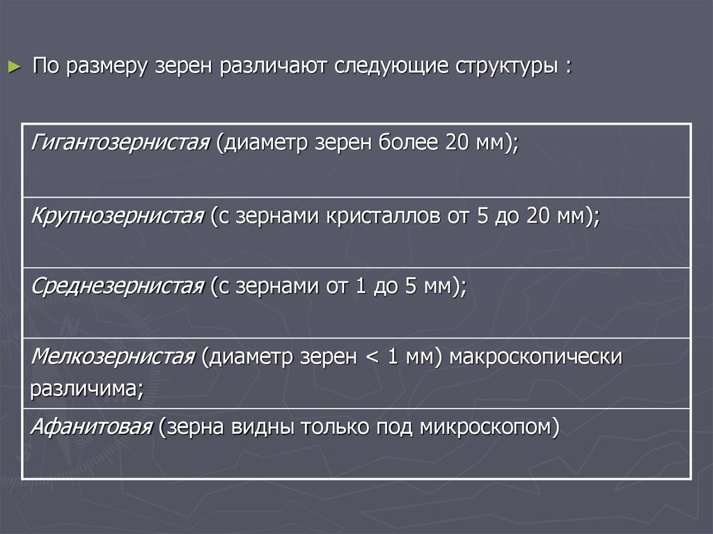 По размеру зерен различают следующие структуры :