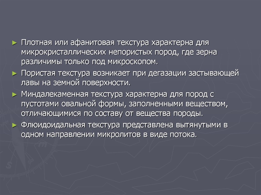 Плотная или афанитовая текстура характерна длямикрокристаллических непористых пород, где зерна