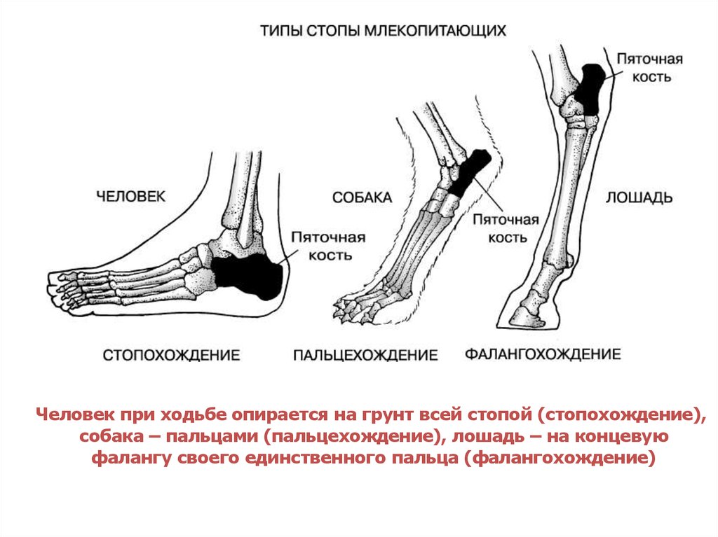 Человек при ходьбе опирается на грунт всей стопой (стопохождение),собака – пальцами (пальцехождение), лошадь – на концевую