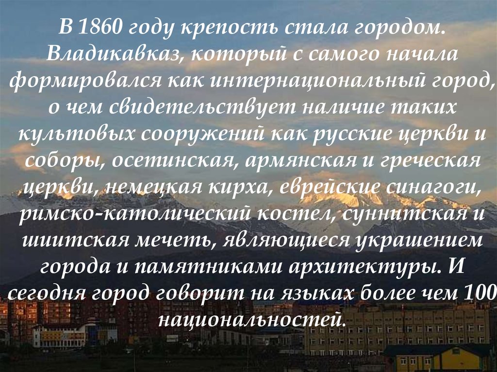 В 1860 году крепость стала городом.Владикавказ, который с самого начала