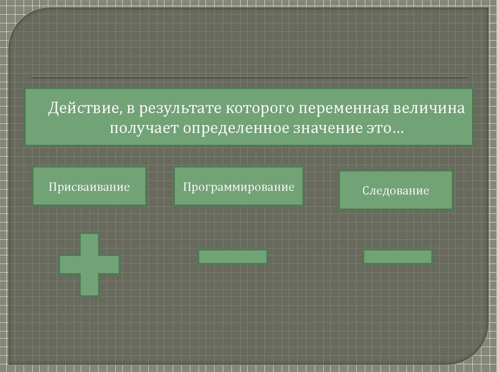 Присваивание-это действие, в результате которого переменнаявеличина получает определенное значение.