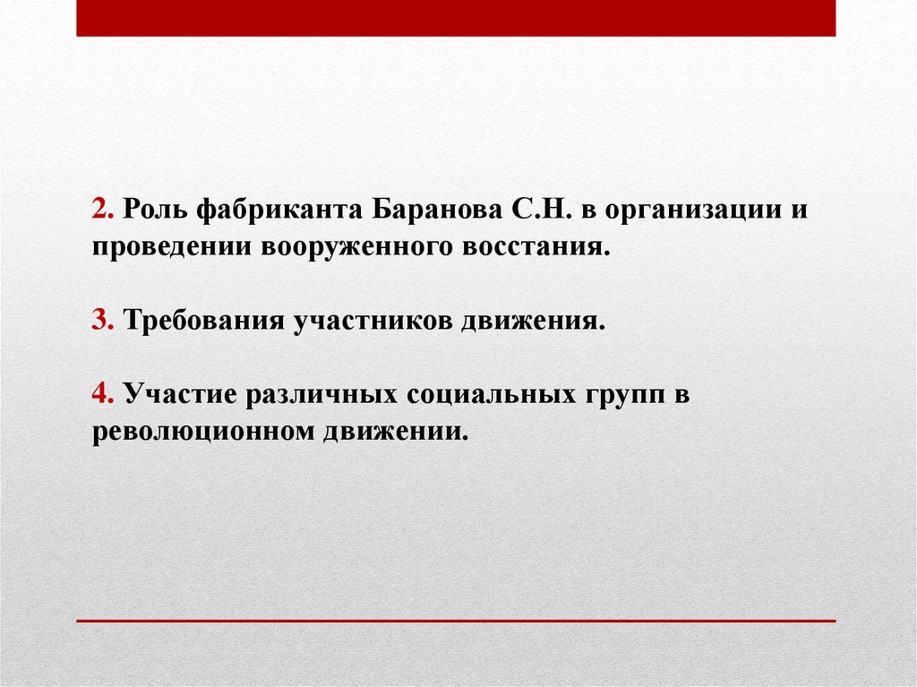2. Роль фабриканта Баранова С.Н. в организации ипроведении вооруженного восстания.
