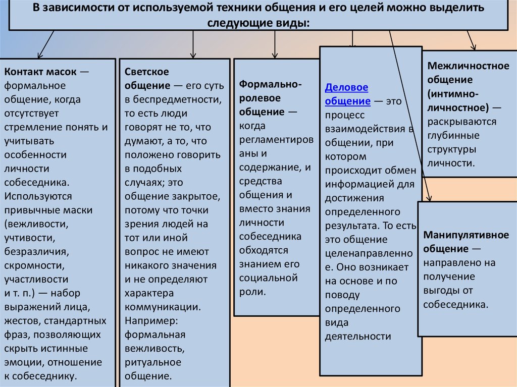 В зависимости от используемой техники общения и его целей можно выделитьследующие виды: