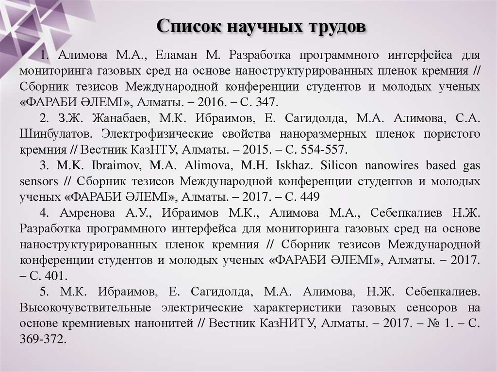 Список научных трудов1. Алимова М.А., Еламан М. Разработка программного интерфейса для
