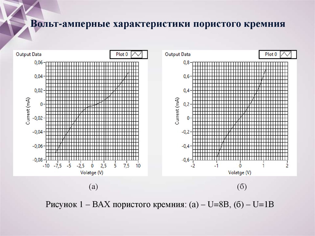 Рисунок 1 – ВАХ пористого кремния: (а) – U=8В, (б) – U=1В