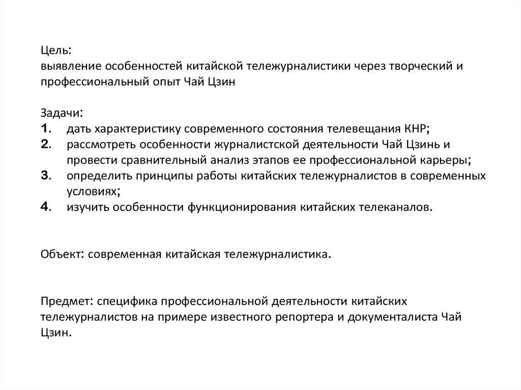Цель:выявление особенностей китайской тележурналистики через творческий и