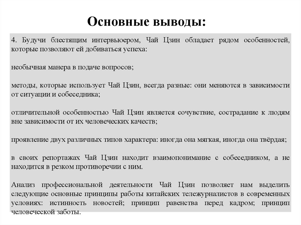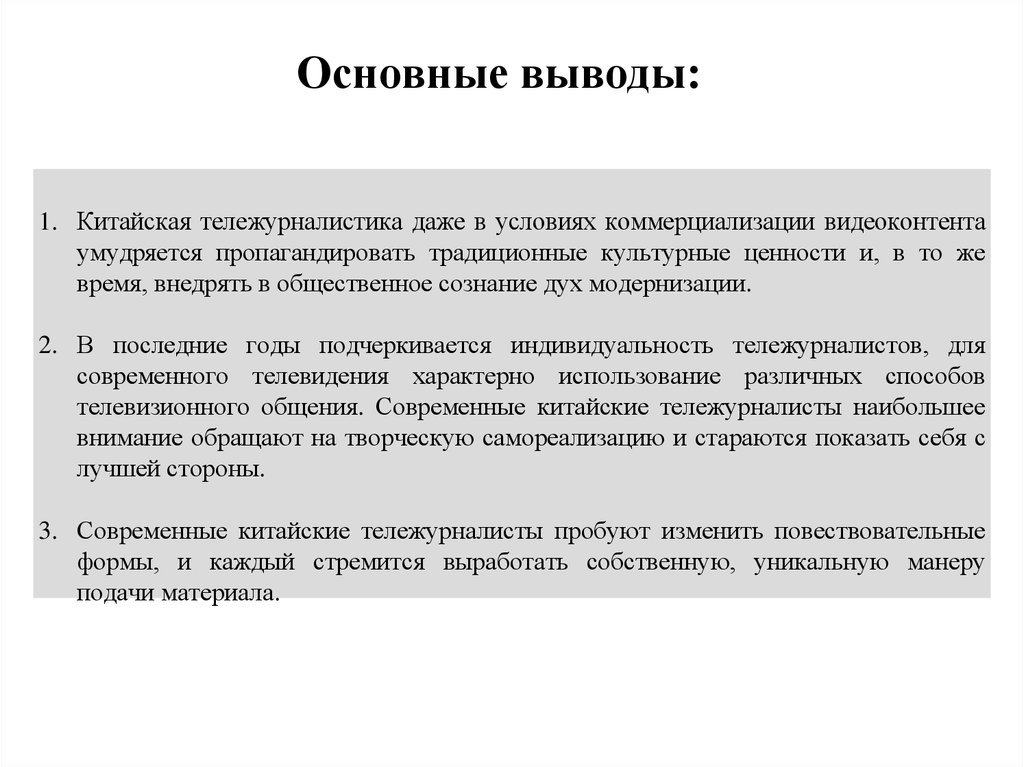 Основные выводы:1. Китайская тележурналистика даже в условиях коммерциализации видеоконтента