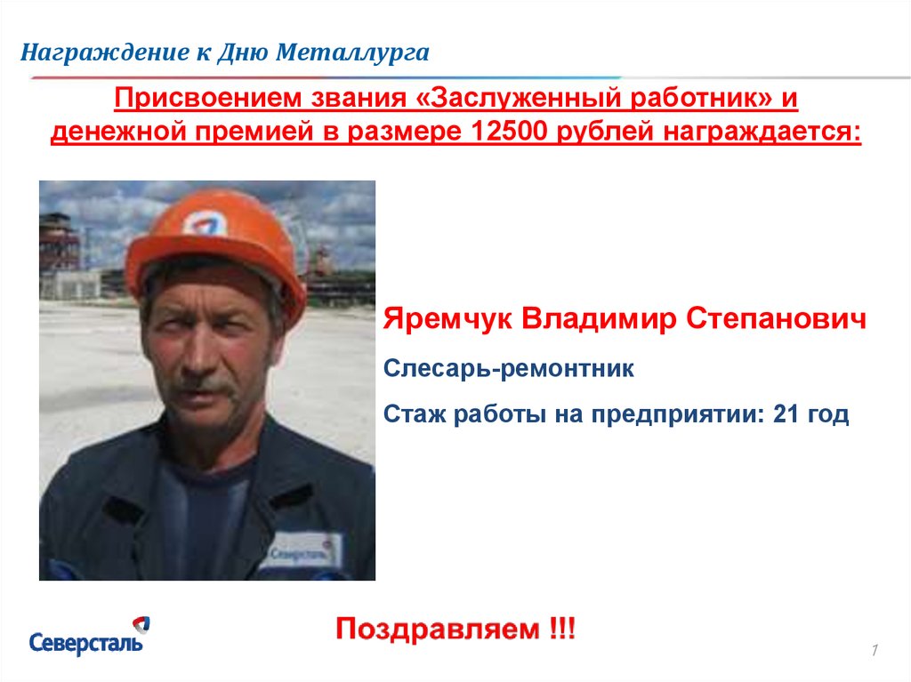 Занесением на Доску почёта ПАО «Северсталь» иденежной премией в размере 8000 рублей награждается: