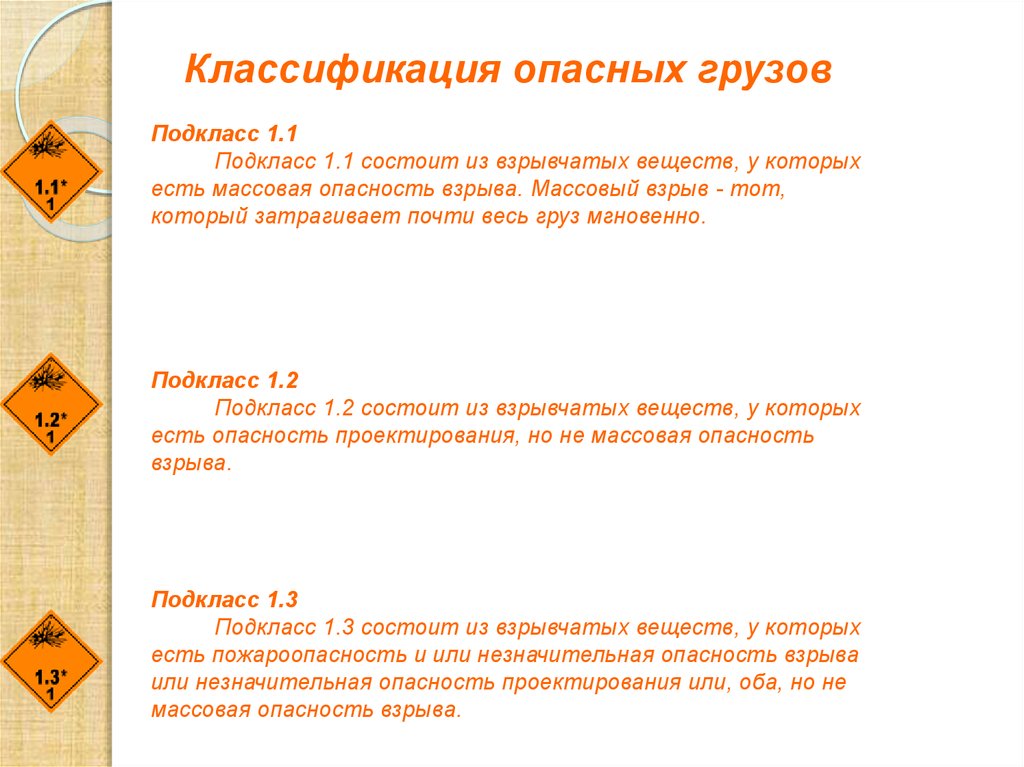 Классификация опасных грузовПодкласс 1.1