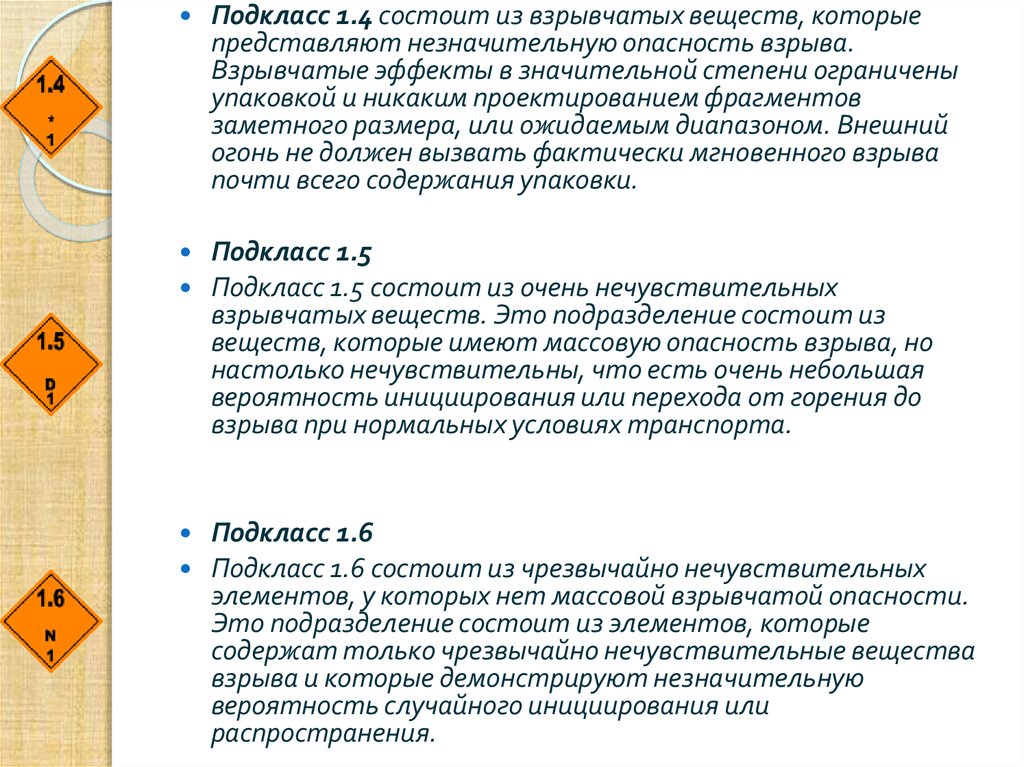 Подкласс 1.4 состоит из взрывчатых веществ, которыепредставляют незначительную опасность взрыва.