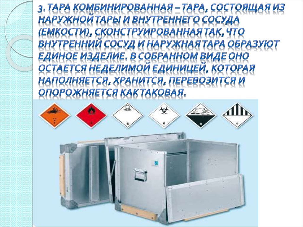 6. Тара комбинированная – тара, состоящая из наружной тары и внутреннего