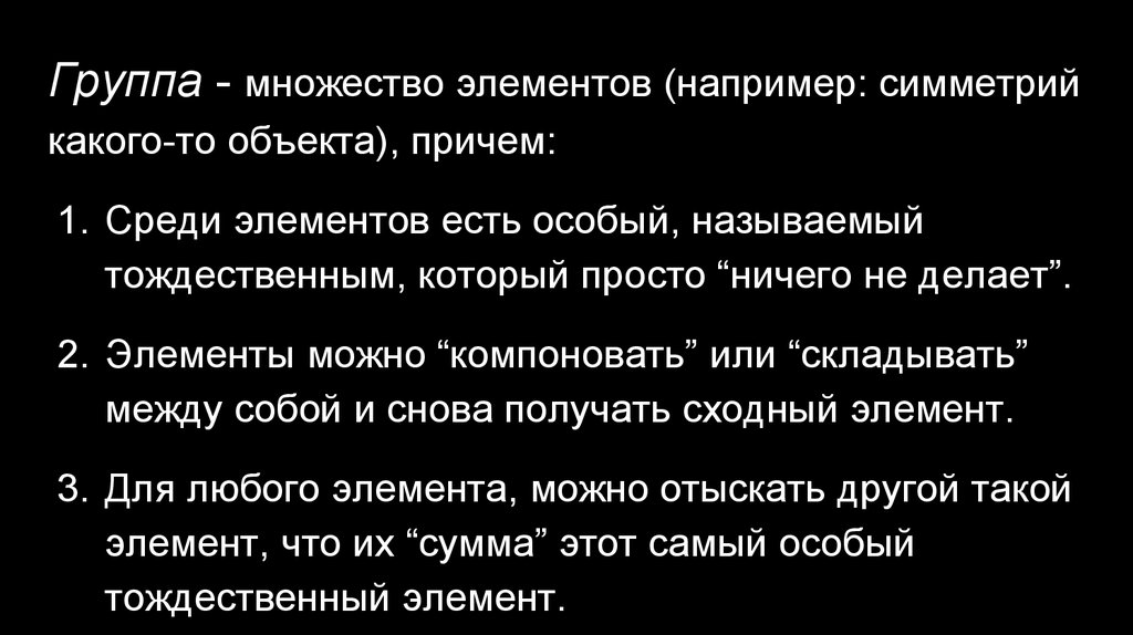Группа - множество элементов (например: симметрийкакого-то объекта), причем: