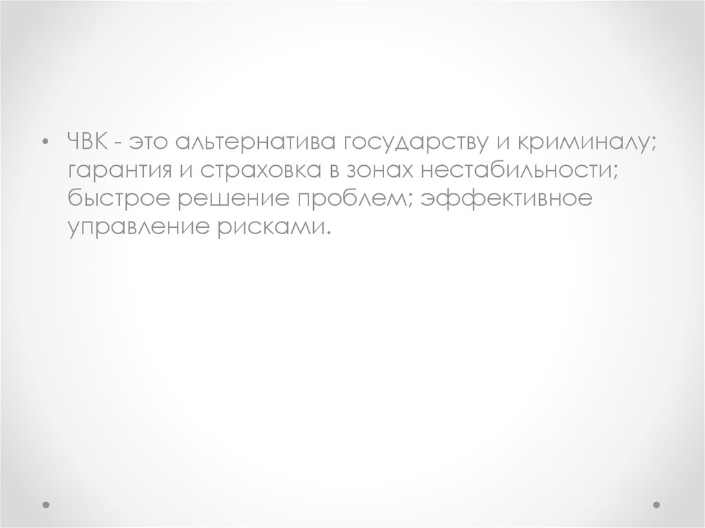 • ЧВК - это альтернатива государству и криминалу;гарантия и страховка в зонах нестабильности;