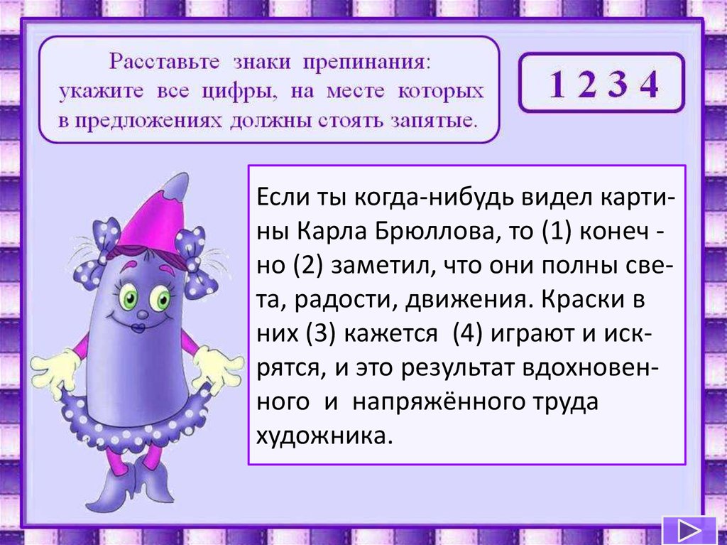 Если ты когда-нибудь видел картины Карла Брюллова, то (1) конеч но (2) заметил, что они полны света, радости, движения. Краски вних (3) кажется (4) играют и искрятся, и это результат вдохновенного и напряжённого труда