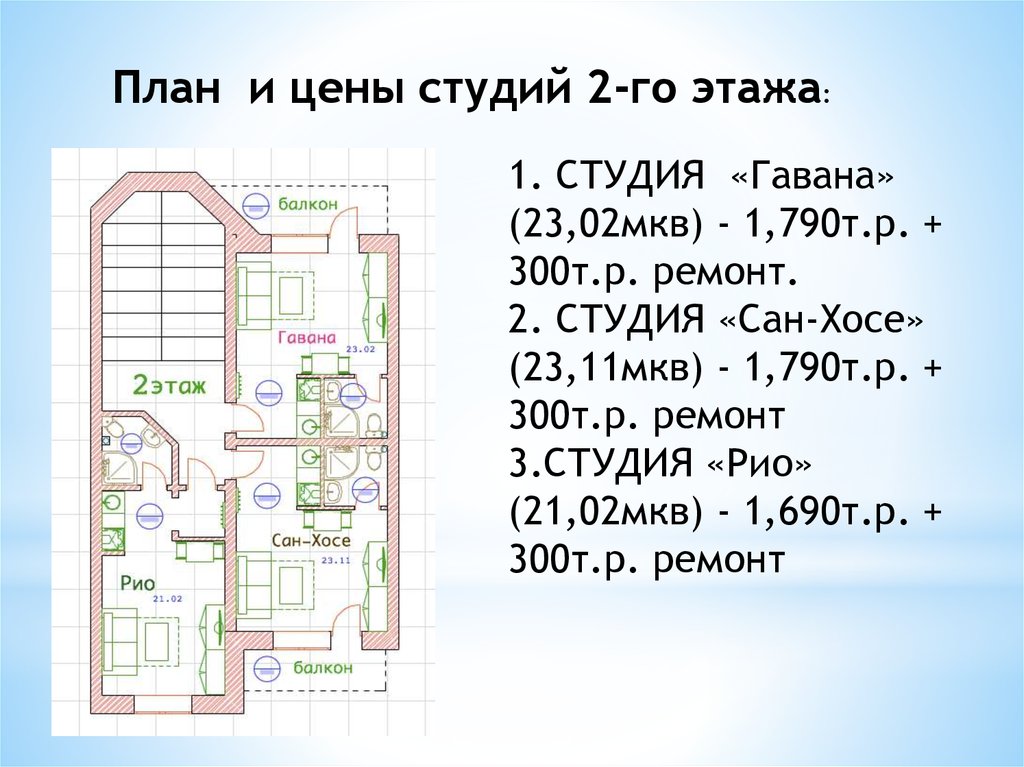 План и цены студий 2-го этажа:1. СТУДИЯ «Гавана»