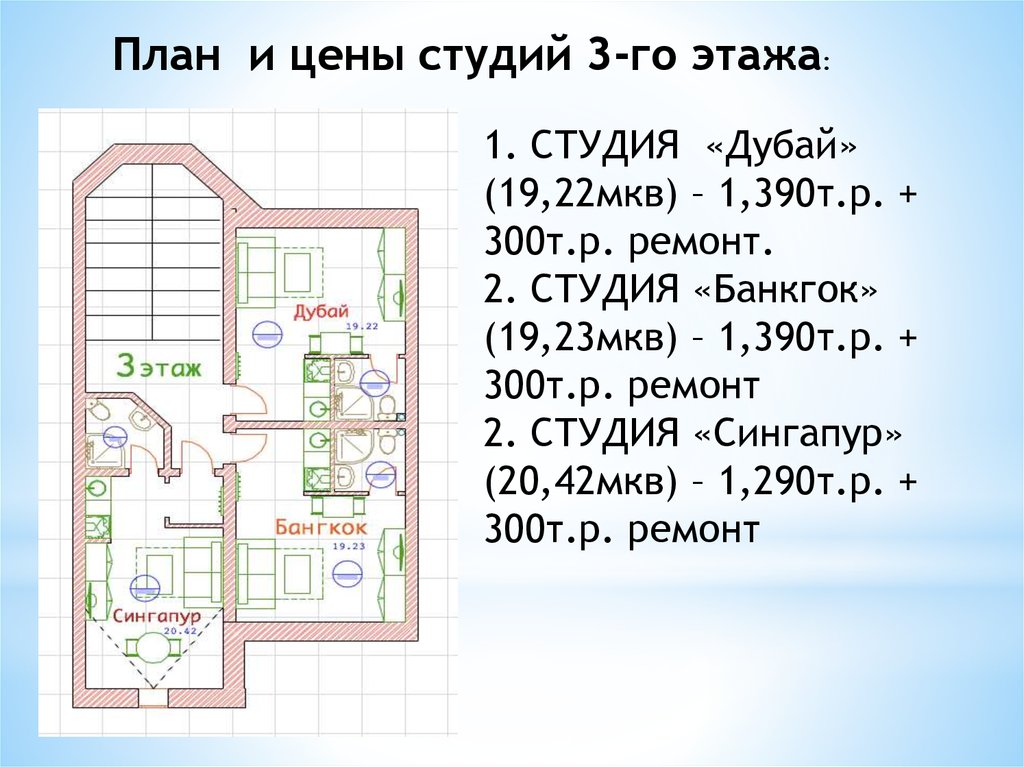 План и цены студий 3-го этажа:1. СТУДИЯ «Дубай»