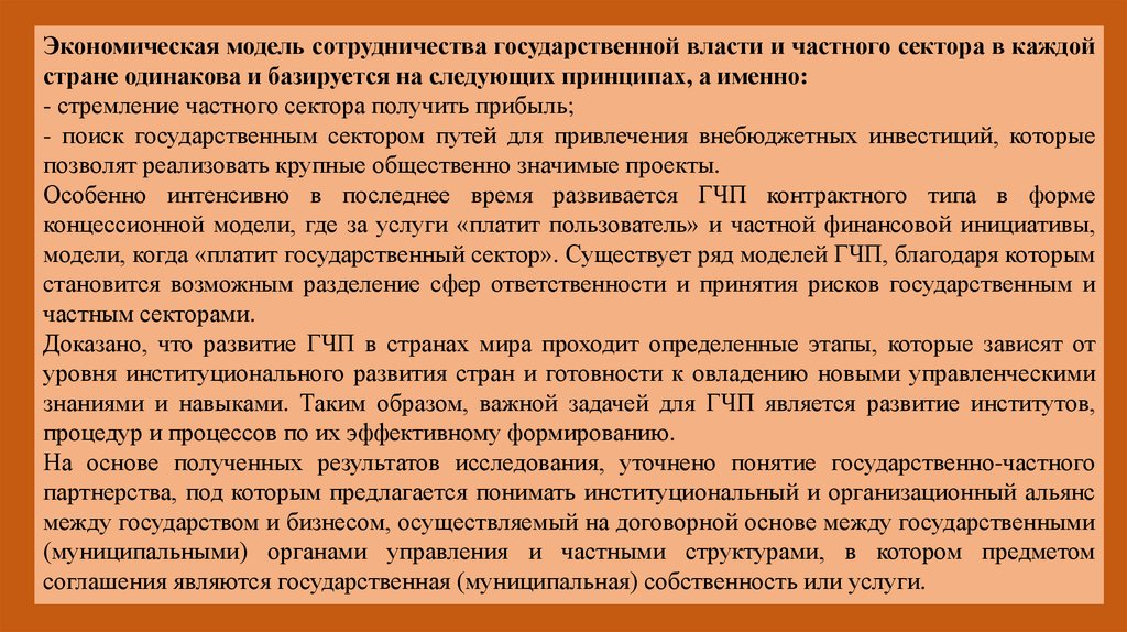 Экономическая модель сотрудничества государственной власти и частного сектора в каждойстране одинакова и базируется на следующих принципах, а именно:
