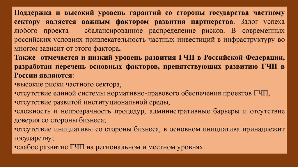 Поддержка и высокий уровень гарантий со стороны государства частномусектору является важным фактором развития партнерства. Залог успеха