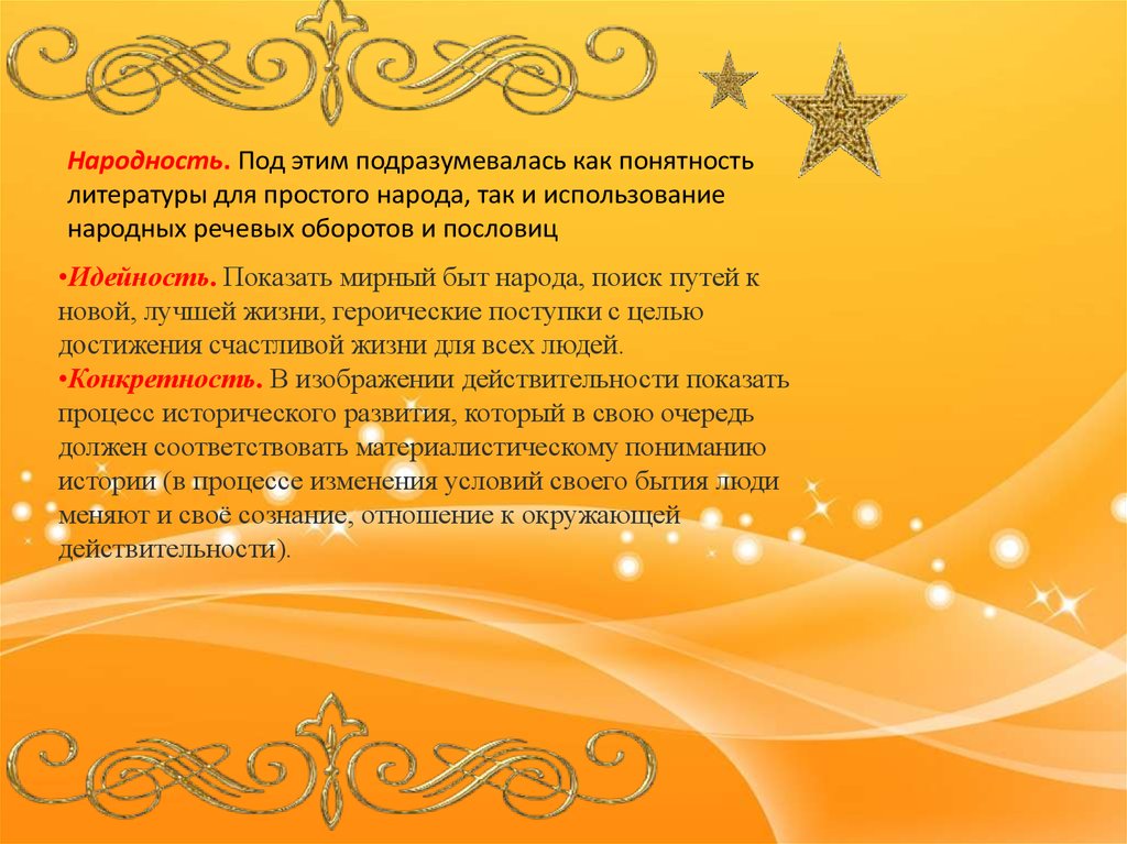 Народность. Под этим подразумевалась как понятностьлитературы для простого народа, так и использование