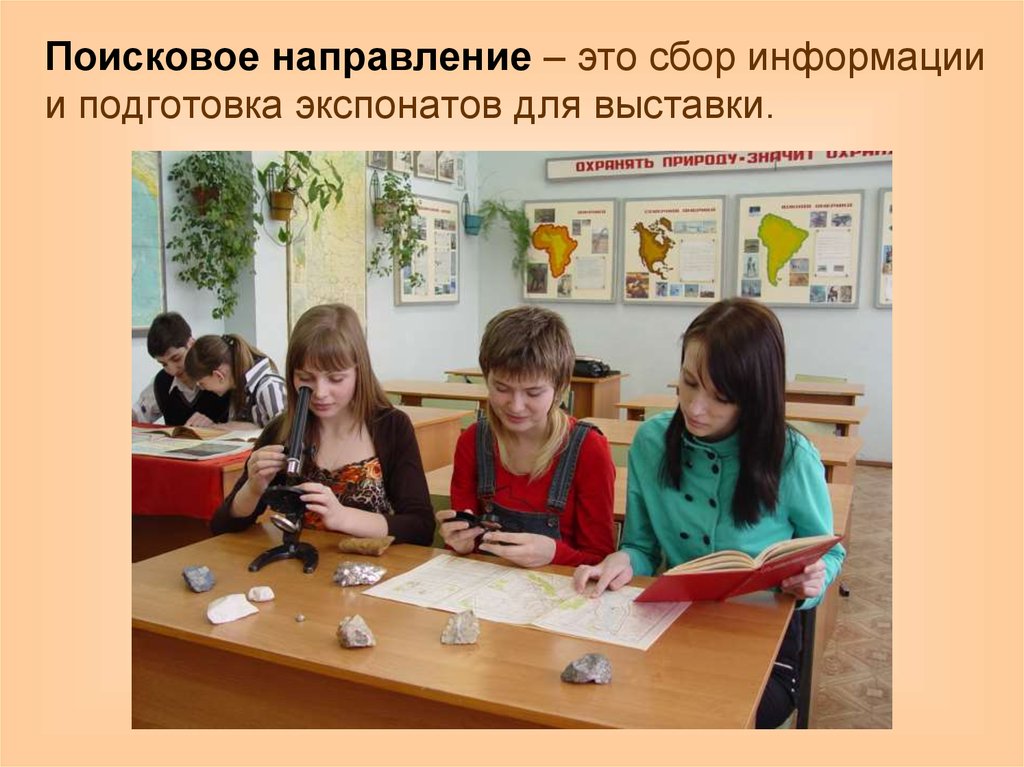 Поисковое направление – это сбор информациии подготовка экспонатов для выставки.