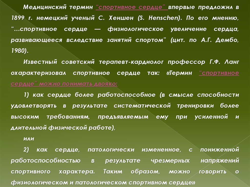 Медицинский термин “спортивное сердце” впервые предложил в1899 г. немецкий ученый С. Хеншен (S. Henschen). По его мнению,