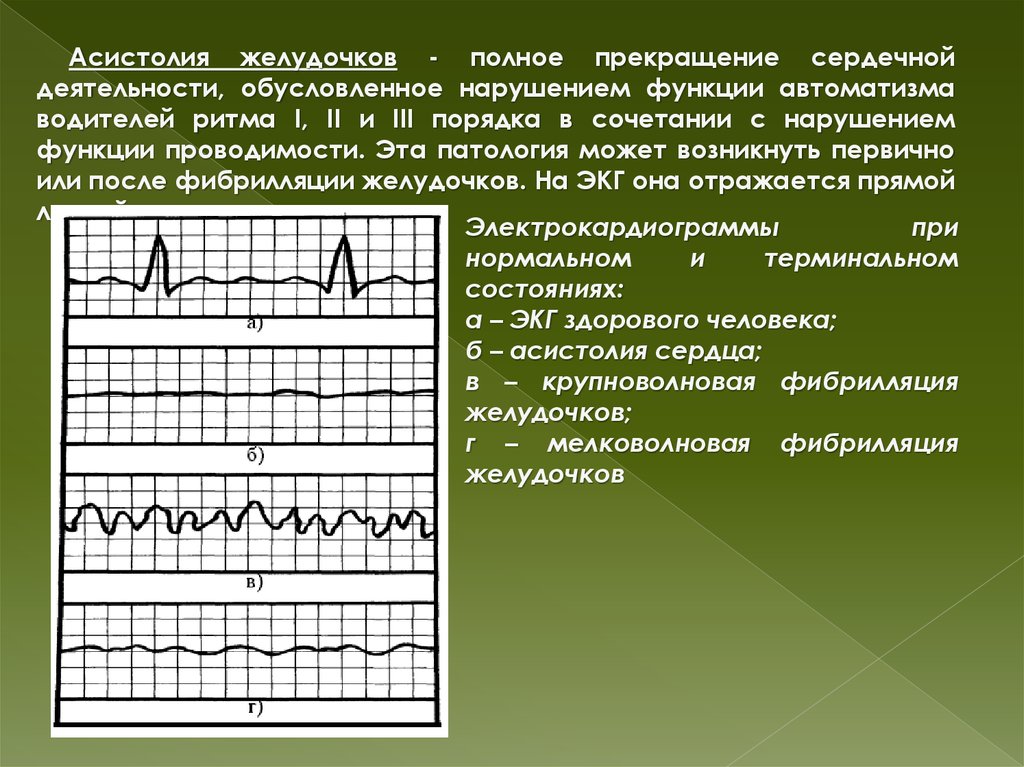 Асистолия желудочков - полное прекращение сердечнойдеятельности, обусловленное нарушением функции автоматизма