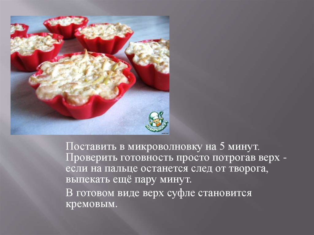 Поставить в микроволновку на 5 минут.Проверить готовность просто потрогав верх если на пальце останется след от творога,