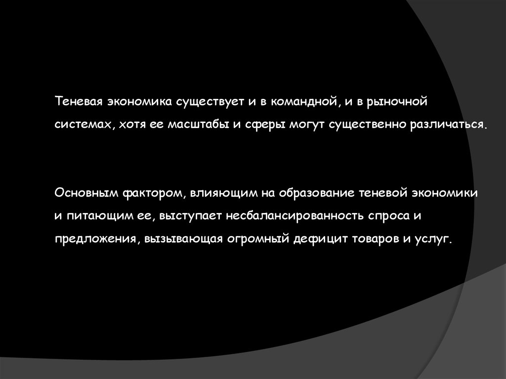 Теневая экономика существует и в командной, и в рыночнойсистемах, хотя ее масштабы и сферы могут существенно различаться.