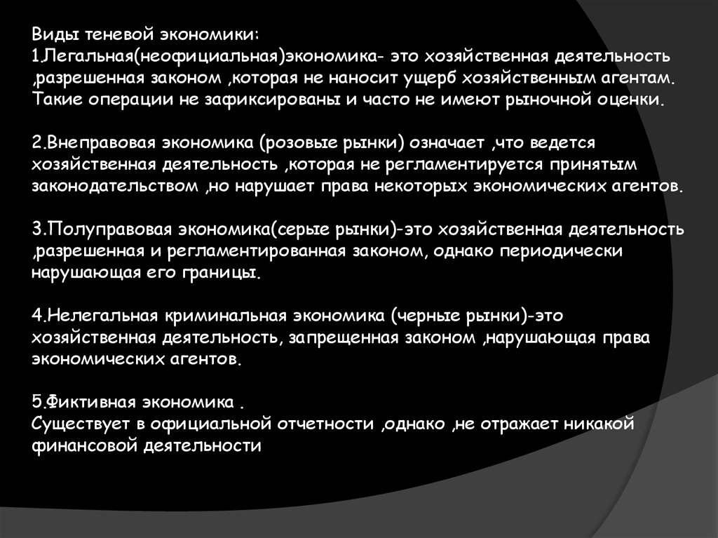 Виды теневой экономики:1.Легальная(неофициальная)экономика- это хозяйственная деятельность