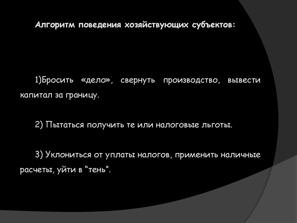 Алгоритм поведения хозяйствующих субъектов:1)Бросить «дело», свернуть производство, вывести