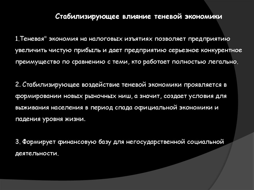 2. Стабилизирующее воздействие теневой экономики проявляется в